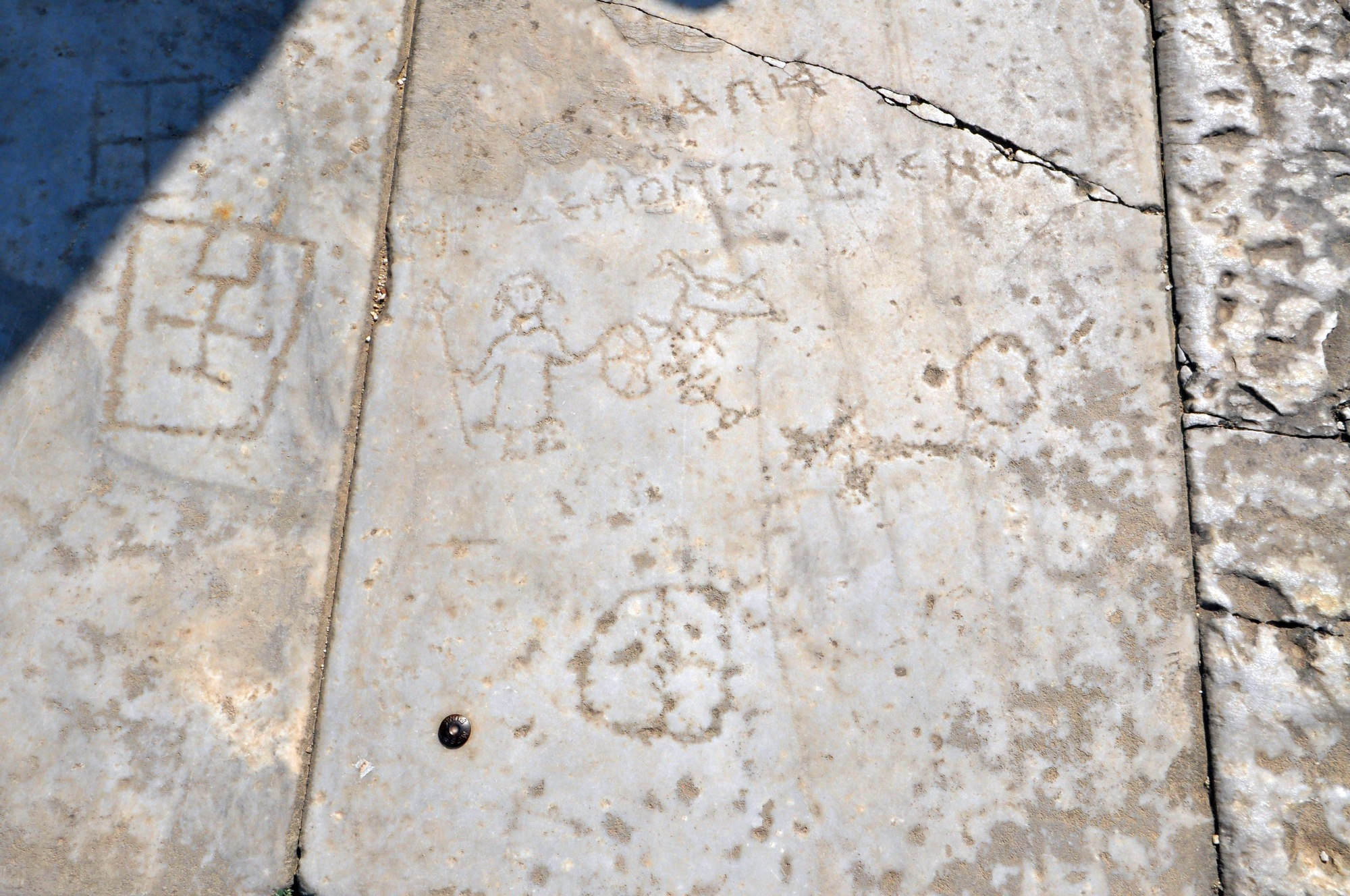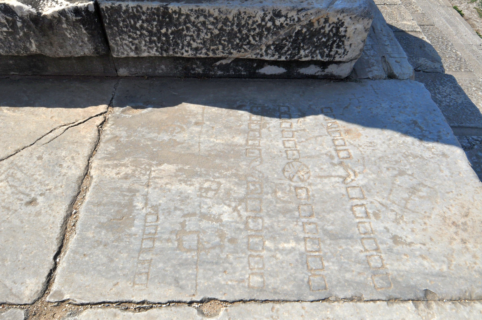 There are many ancient archaeological sites which have graffito carvings etched into the stone floors. I have seen them in many places, Miletus, the Sacred Road, the Temple of Apollo, and Ephesus to name a few and I suspect they would also be present in most Ancient Greek cities. I have always been curious to learn about these, what are they for or what do they mean?