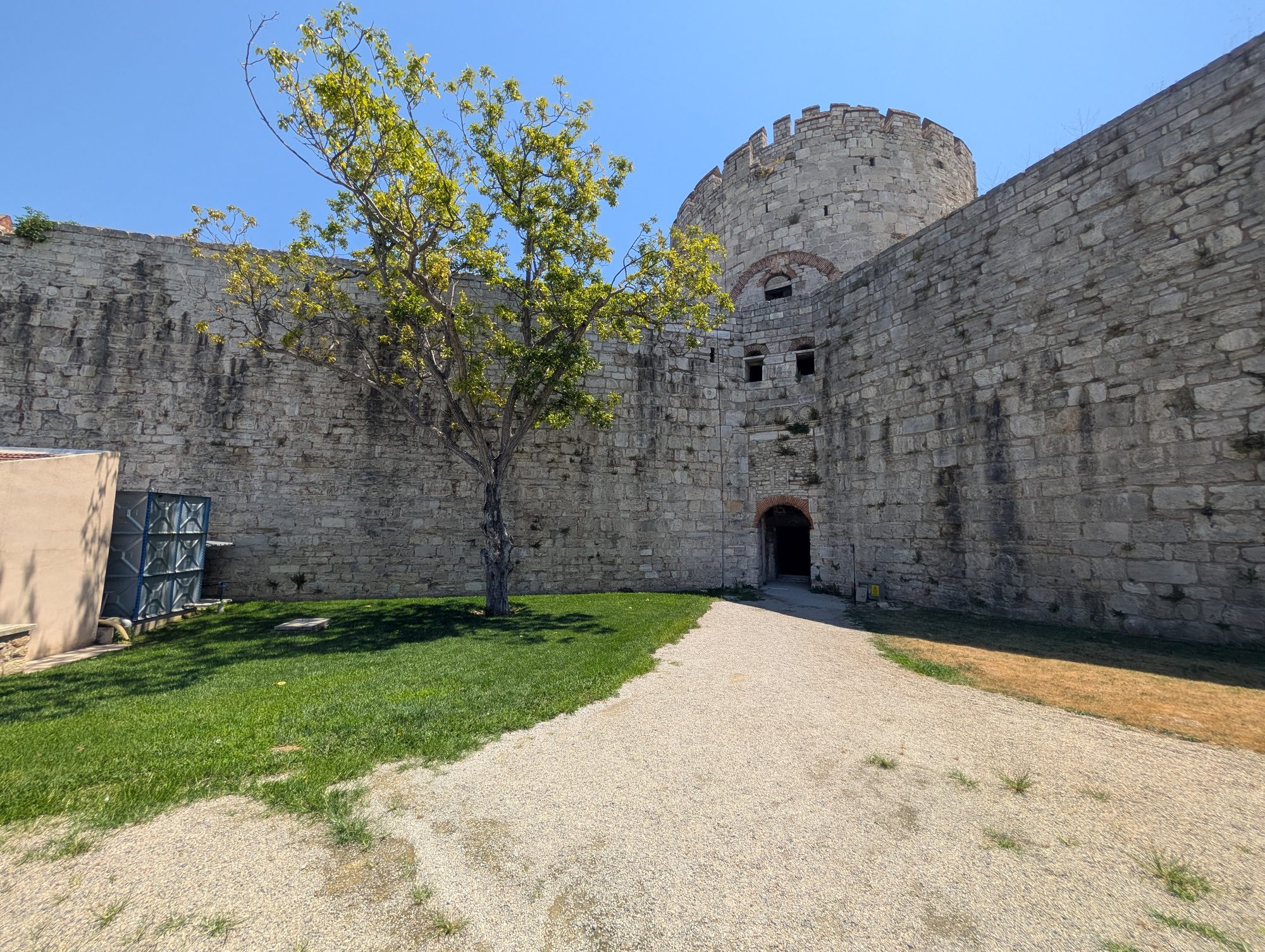 The idea of fortifying this spot was far from new. As early as the 5th century, a circular stronghold may have stood here, remembered in later sources as the Castrum Rotundum — though both its layout and exact position remain a mystery. Centuries later, another fortress rose behind the Golden Gate of the Theodosian Walls. First begun under Emperor John I Tzimiskes (969–976) and completed during the reign of Manuel I Komnenos, it was armed with five towers and became known as the Pentapyrgion, the Fortress of Five Towers. This imposing citadel, however, met a violent end in 1204, when the armies of the Fourth Crusade stormed Constantinople and left much of the city in ruins.