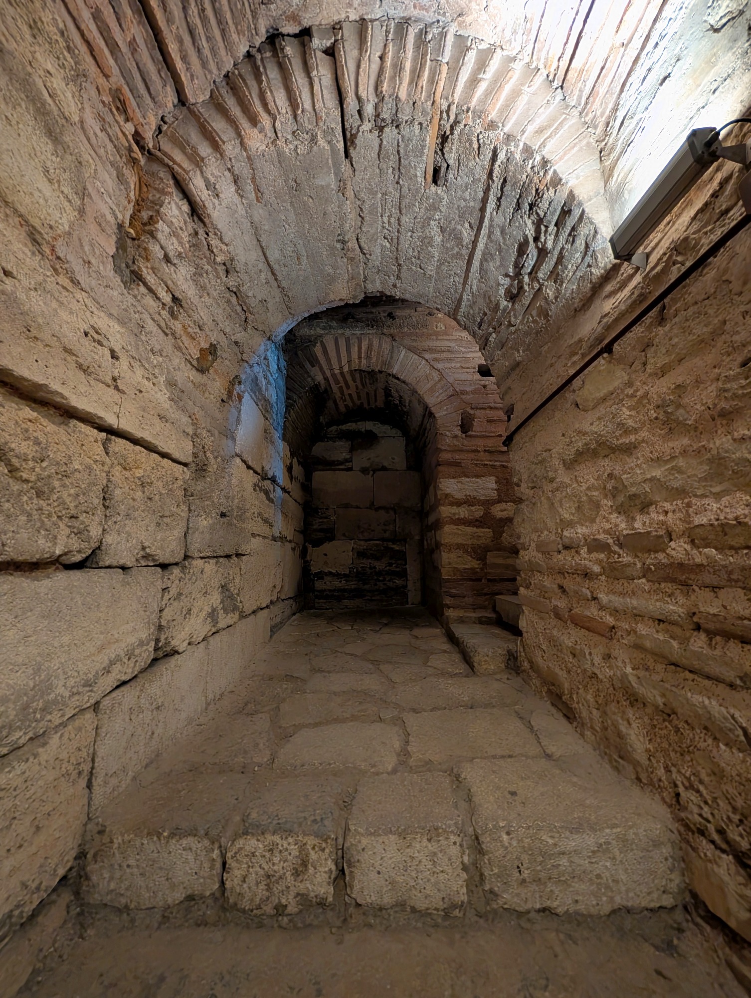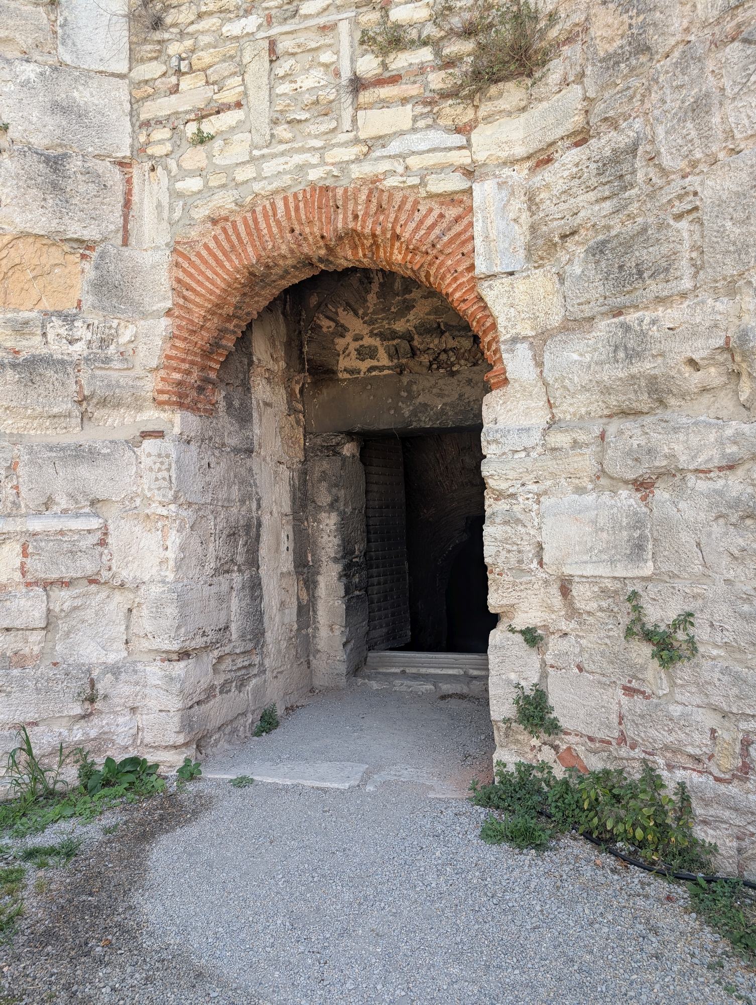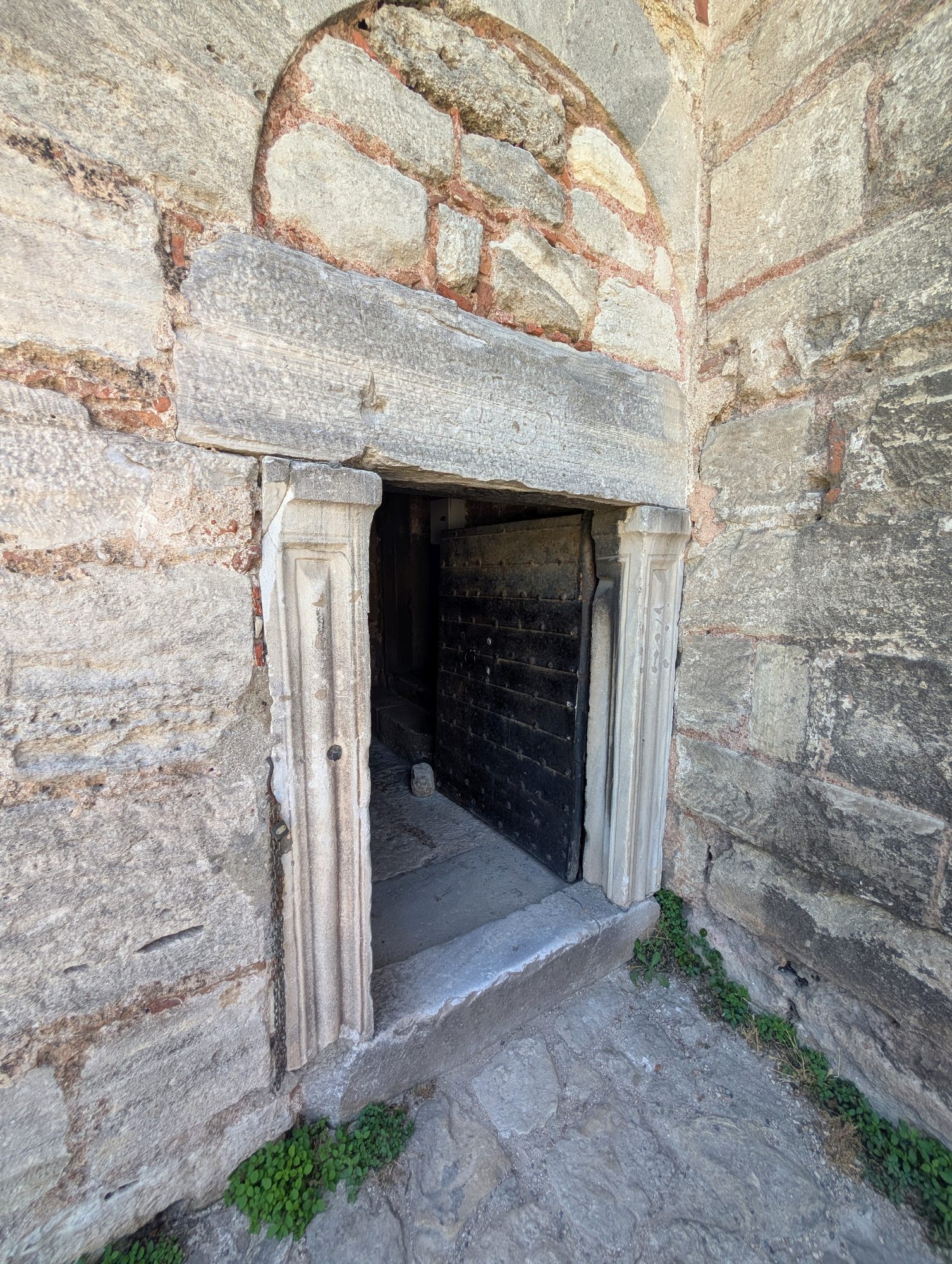 A 1686 drawing shows the front and rear gates aligned, and the later Ottoman alterations appear to shift the entrance slightly northward. In the masonry of the curtain walls, one can still see a seam between two phases: a massive Byzantine wall on the south and a thinner Ottoman rebuild to its north. The Byzantine wall angles inward in an L-shape by about 30 cm — a feature also found in other gates, perhaps to allow door frames to sit flush.