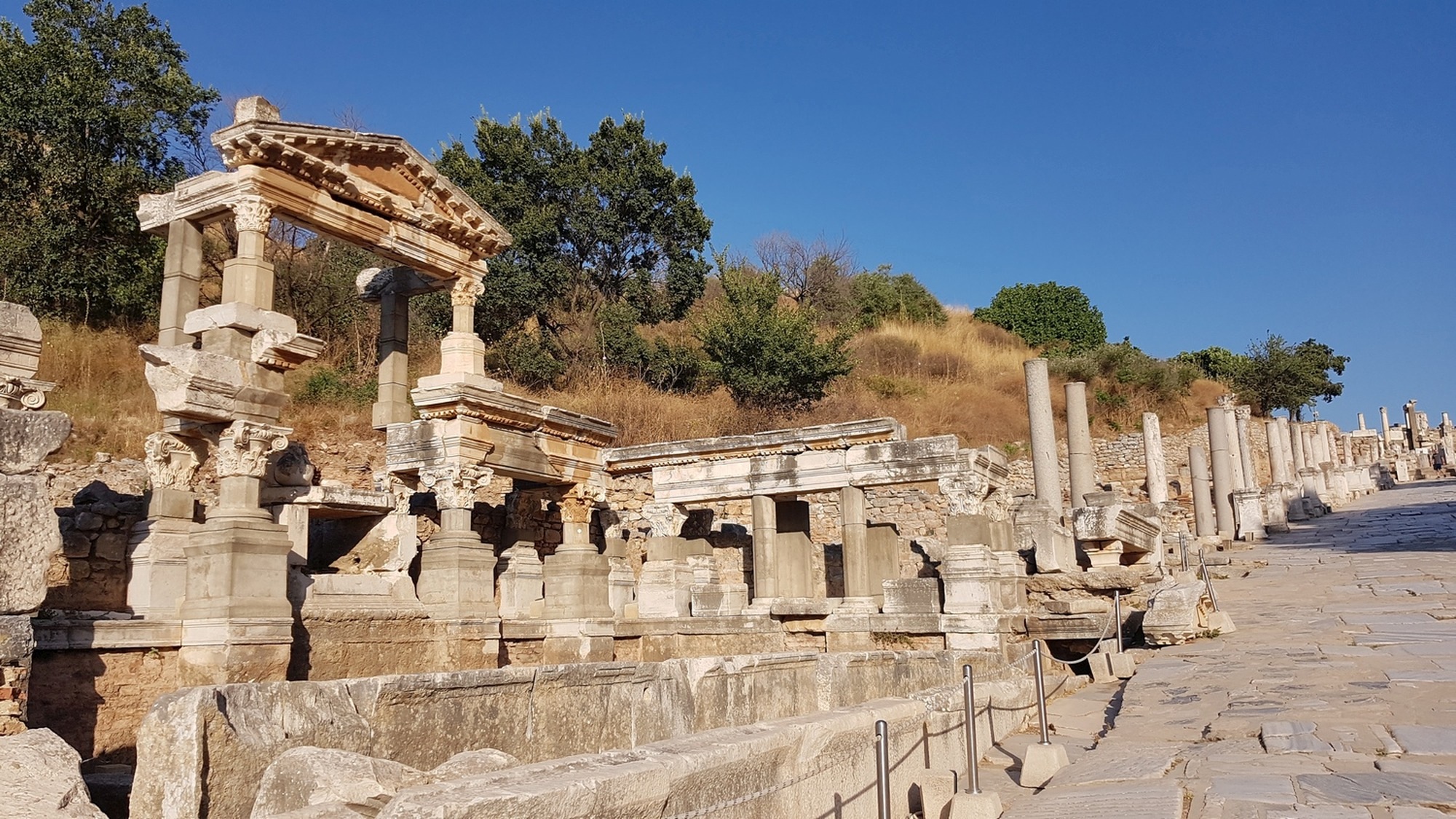 The look at the north-eastern side of the Curetes Street offers us a glimpse into the secrets of water supply to Ephesus, as in this part of the city numerous monuments dedicated to this function were erected. The first one of them, as one walks down the street, is the Trajan's Nymphaeum. It has the shape of a pool surrounded on three sides by a two-storey structure. Like Rome, ancient Ephesus was also a city of fountains. Nowadays, with the running water readily available in our kitchens and bathrooms, we frequently underestimate the function of public fountains, treating them as a purely decorative element of the cityscape. However, in ancient cities of the Roman era, the majority of households had to draw drinking water from such fountains, and every day citizens, servants, and slaves rushed with vessels and buckets to fill them at the public fountains. These structures varied from simple ones to the elaborate monuments paid for by wealthy sponsors to commemorate their names or pay respects to the rulers of the Empire.